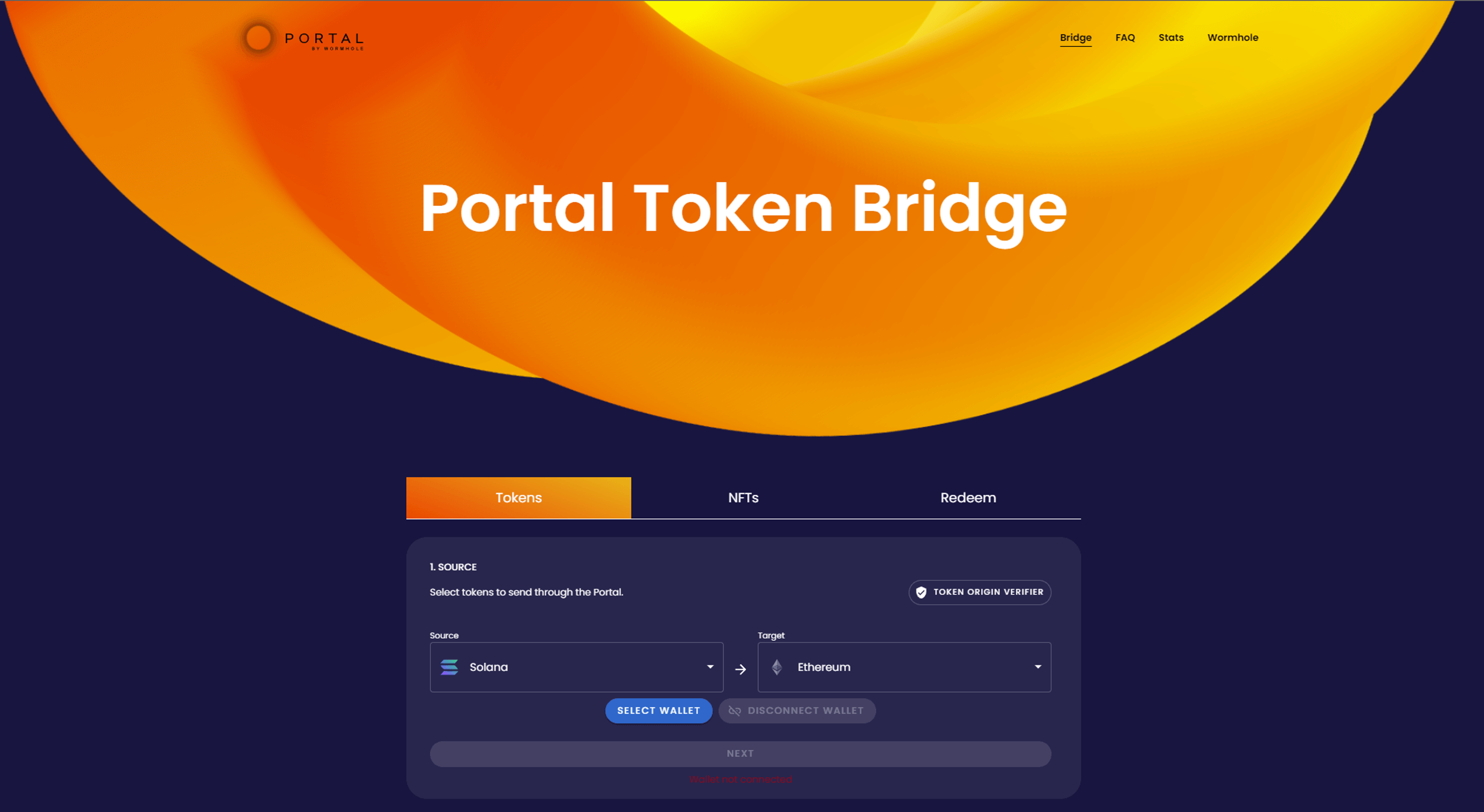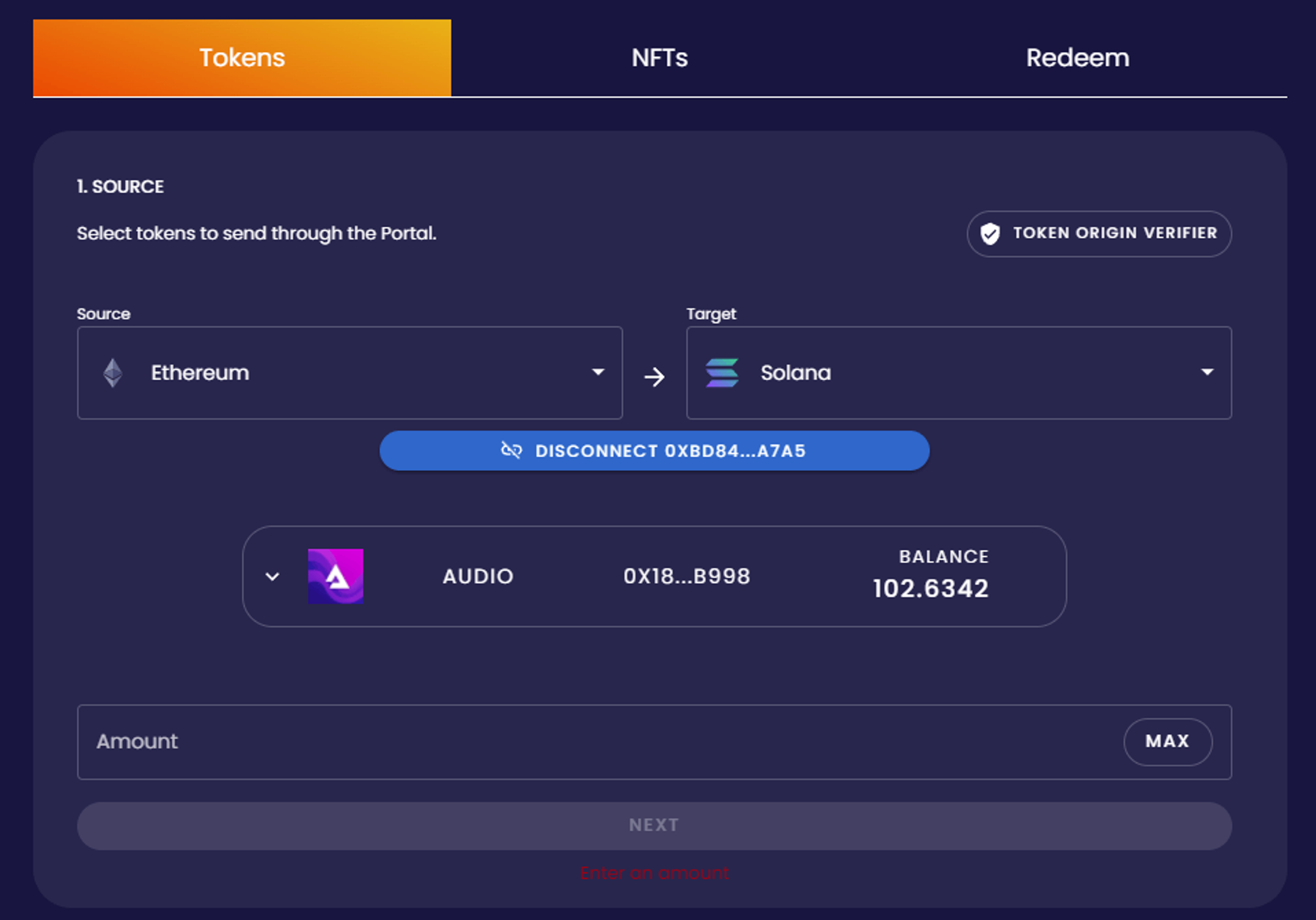 Welcome to the Portal Token Bridge where you can transfer tokens from one blockchain to another. With the bridge we will be able to transfer AUDIO tokens from Ethereum to Solana by completing a few simple steps. First you will need to identify the source blockchain that your tokens are currently residing on. Next you will need to select the target blockchain in which you intend to send your tokens to.