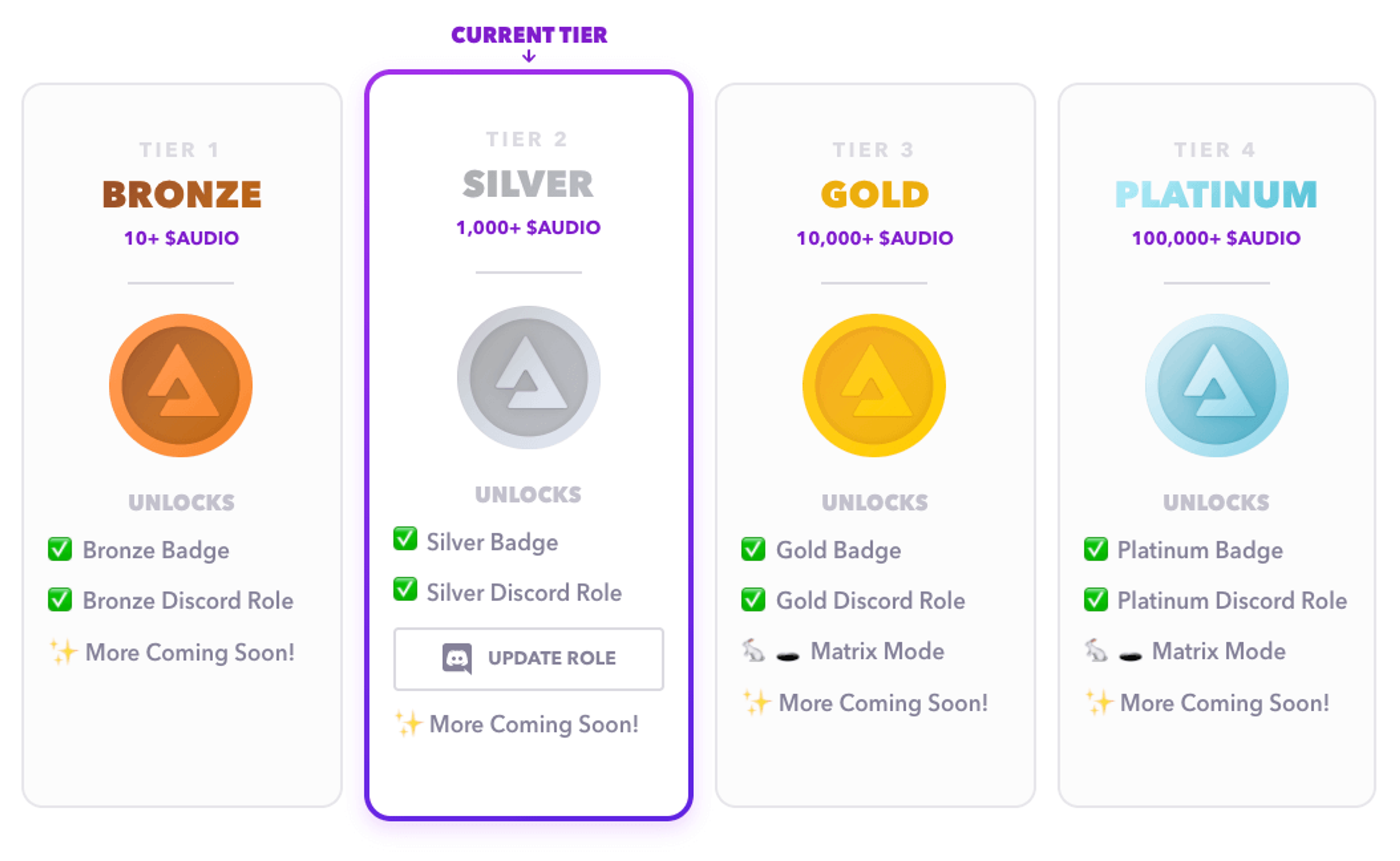 Starting today, users that hold enough $AUDIO in their Audius account will unlock new VIP tiers– with these tiers users will gain a new $AUDIO badge, visible throughout the app and unlock exclusive new features as they’re released.