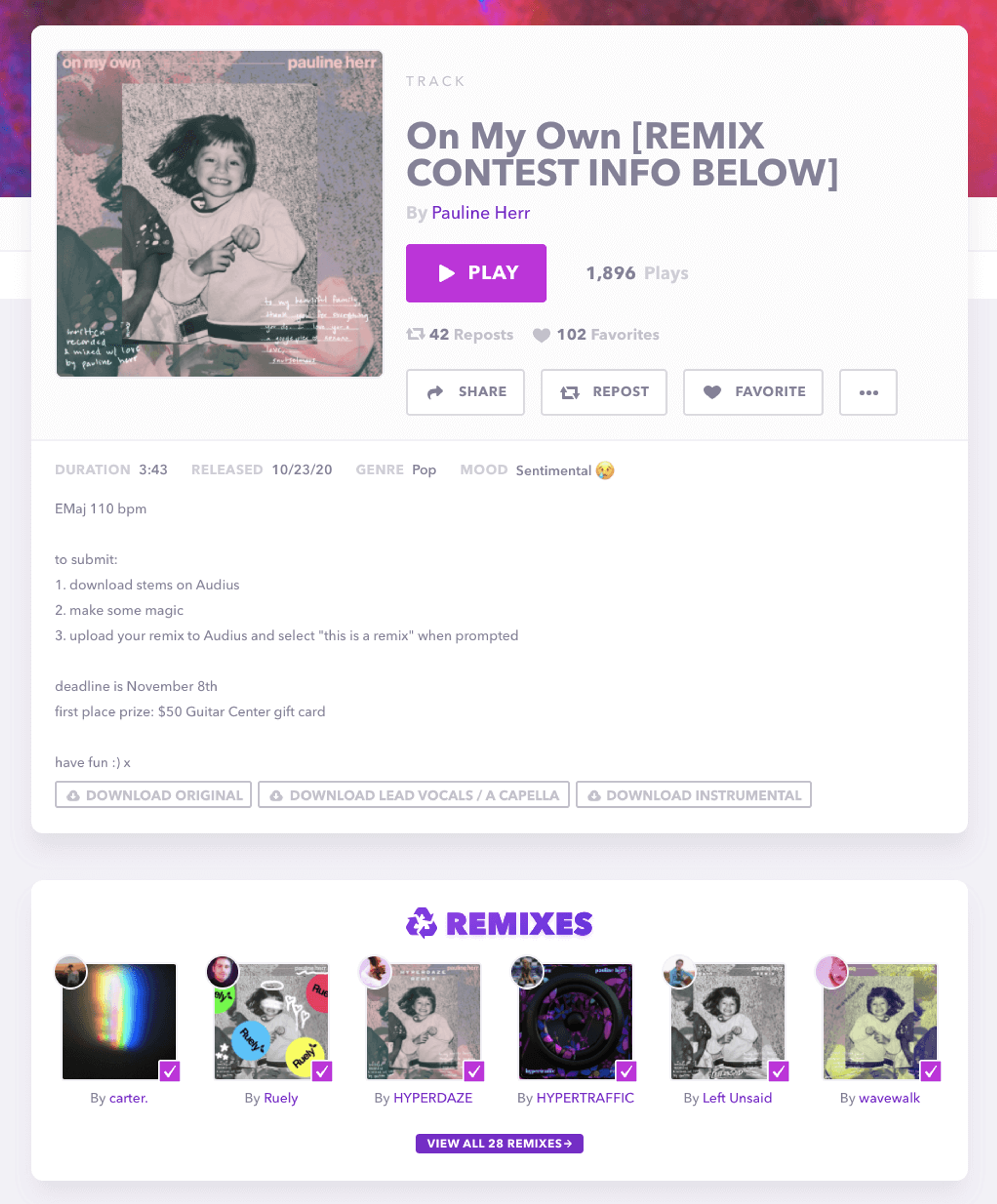 Looking at this remix contest from Pauline Herr, you’ll notice that a pink check mark in the bottom right marking a remix as ‘Verified’. This means that Pauline gave it a stamp of approval either in the form of a like or a repost. Not all Verified remixes receive a prize or official release, but it’s a great way to show your community social signal that their hard work is appreciated.