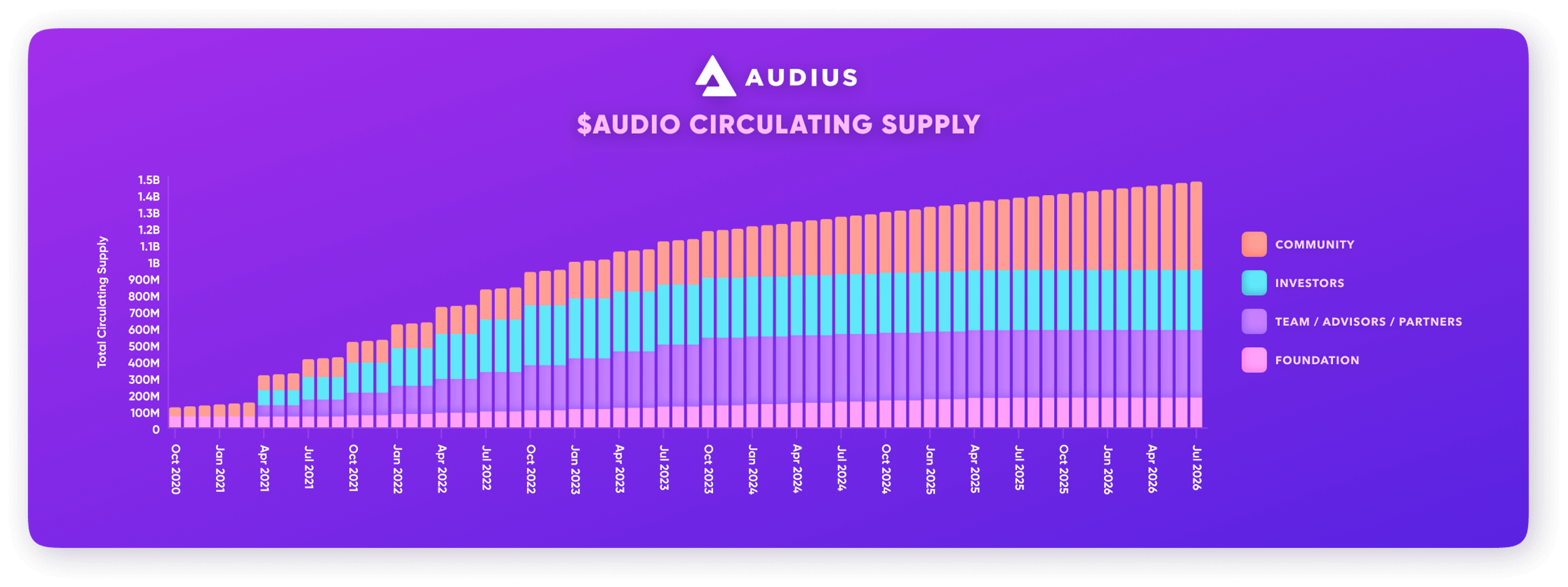 For our token nerds out there, the ‘soon’ in ‘coming soon’ is here. Audius is proud to present the genesis distribution of $AUDIO, consisting of a supply of 1B tokens at launch. Here’s a look at our circulating supply through July of 2026.