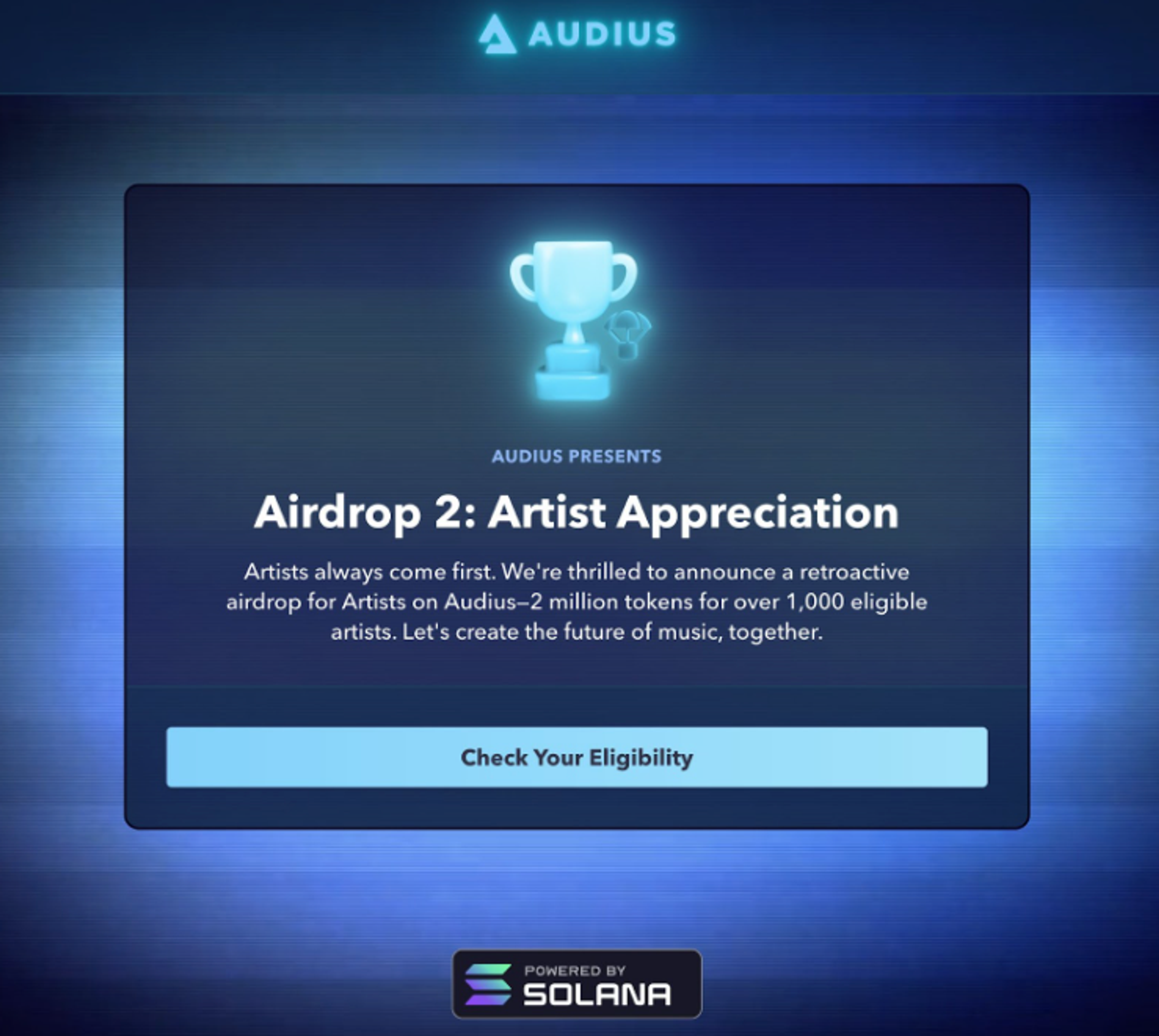 Our Artist Appreciation Airdrop went out to more than 1,000 eligible artists and users last month, as Audius continues its mission to put artists first. Remember, airdrops must be claimed before they expire (on 05/13/25). It’s not too late to see if you qualified!